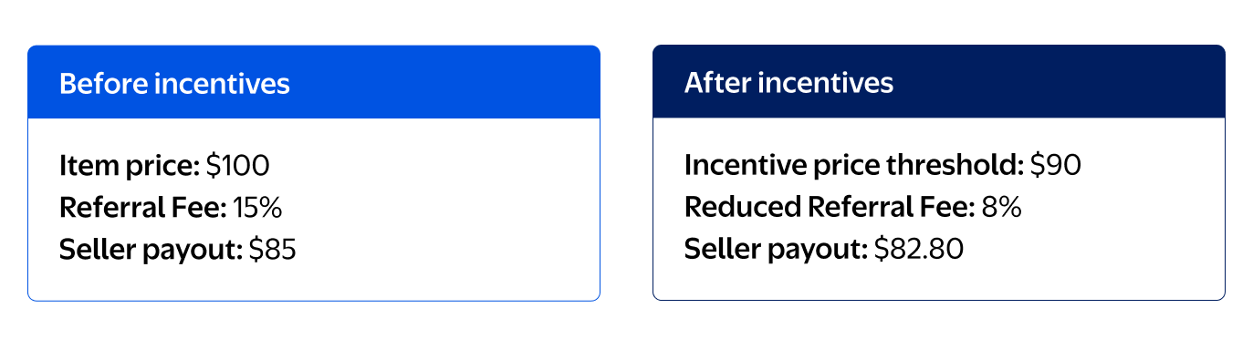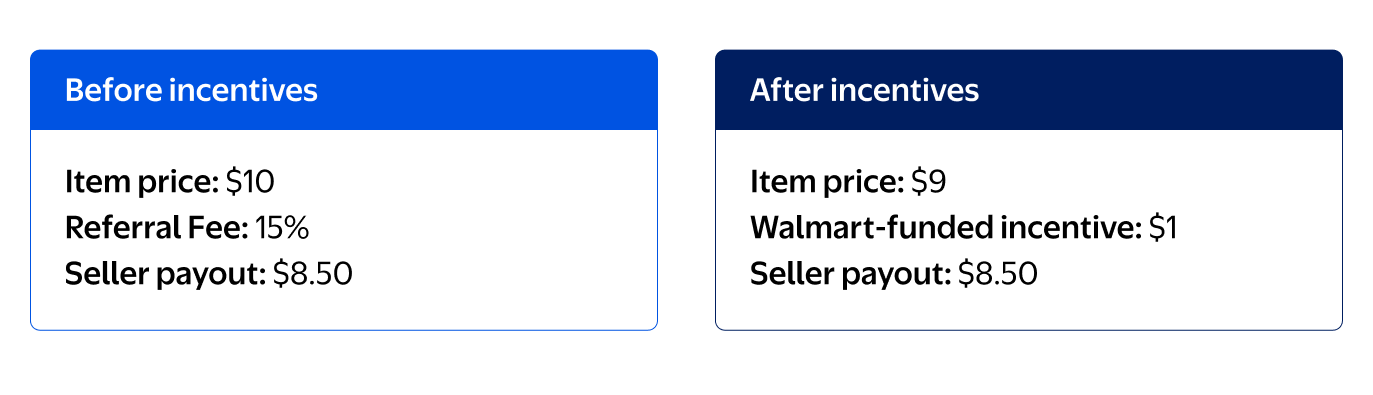 Walmart will provide a Reduced Referral Fee that represents the promotional Referral Fee offered during the incentive enrollment period. Your item price will automatically be adjusted to the incentive price listed in the Ready to enroll tab on the Incentives page. You can always update the price for items enrolled in Reduced Referral Fee incentives at any time, but you’ll only earn the stated Reduced Referral Fee if you keep the enrolled item price within the incentive price threshold suggested for the duration of the incentive period.