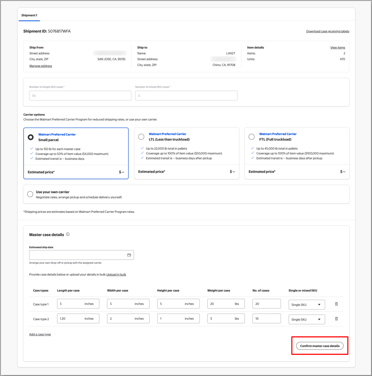 When you send inventory to Walmart Fulfillment Services (WFS), you can use a Walmart preferred carrier to ship and schedule delivery. For full truckload (FTL) and some less than truckload (LTL), we’ll also schedule the carrier pickup for you. In this guide, learn how to select a preferred carrier and get an estimated shipping price.